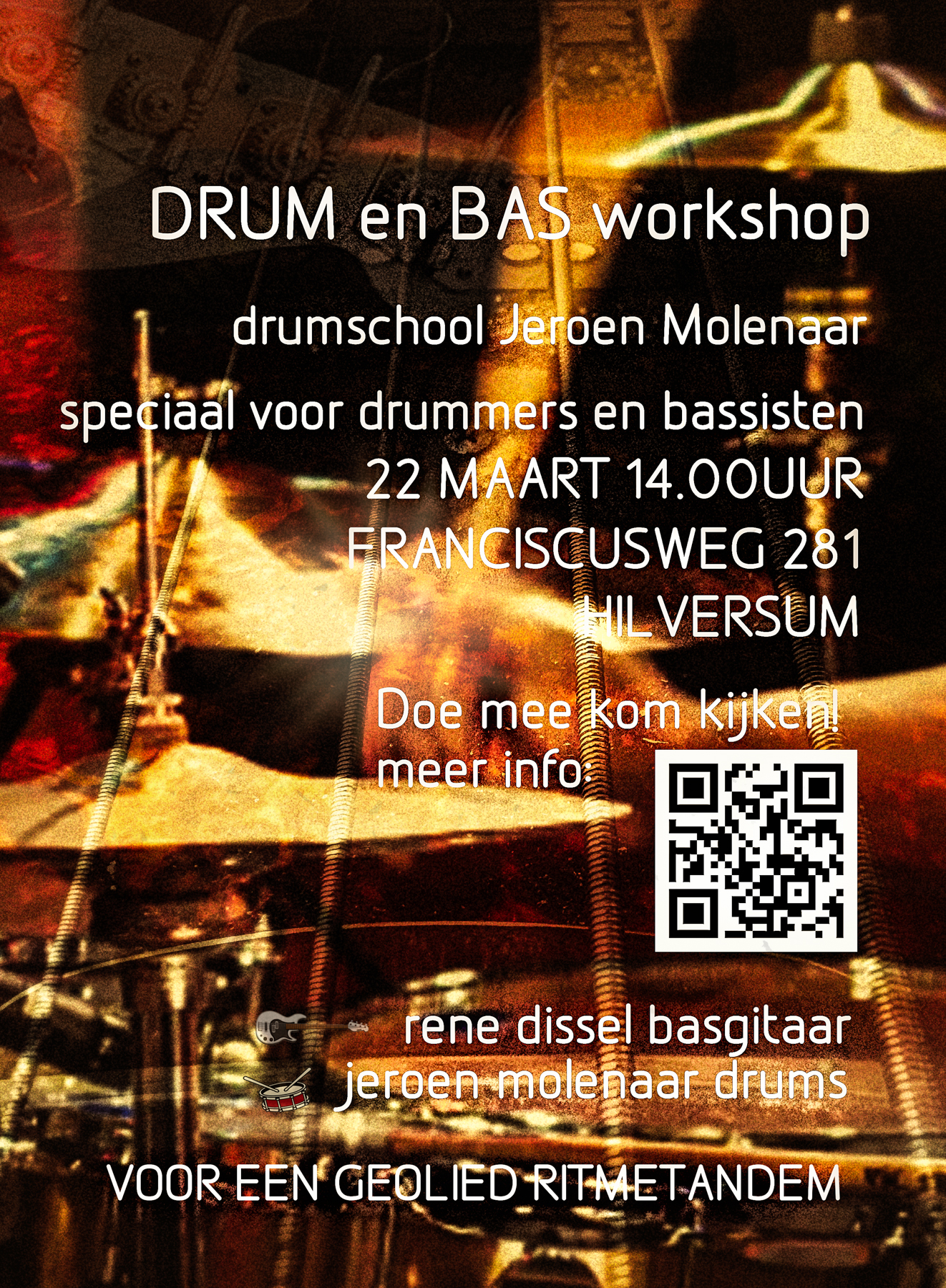 Jeroen Molenaar drummer en ervaren docent, actief in diverse projecten en bekend om zijn sterke groove en muzikale veelzijdigheid. René Dissel docent bas en drums, met jarenlange ervaring als muzikant en docent, ook op conservatoriumniveau. Zijn lessen rond drums en bas zijn inmiddels een vaste en succesvolle formule. Geeft nu ook basgitaarles bij de drumschool van Jeroen.